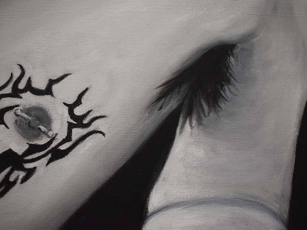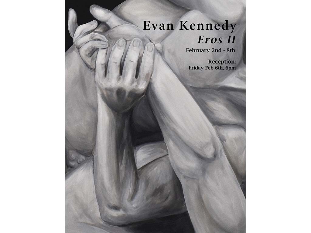 “Eros,” explores the complex relationship between queer erotica, art history and expressions of desire and intimacy. My paintings incorporate both the brashness of the leather subculture, to the quiet and tender intimacies of daily life. From the creation of my own canvases, to the deeply personal subject matter, my work is grounded in art history as well as queer history. The tension between the themes of the work, as well as the visual contrast creates dynamic and resonant artworks.
